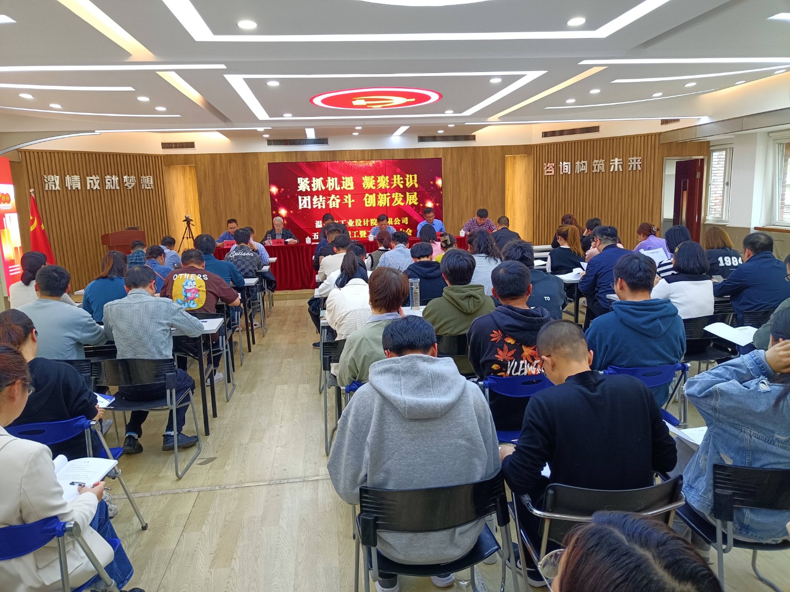 4月14日下午,在莊嚴的國歌聲中,工業(yè)院第五屆二次職工暨工會會員大會隆重召開??偨浝韰羌覐姟⒏笨偨浝韽垥晕涞阮I導班子成員和全體員工出席會議,會議由副總經理、工會主席董文燁主持。